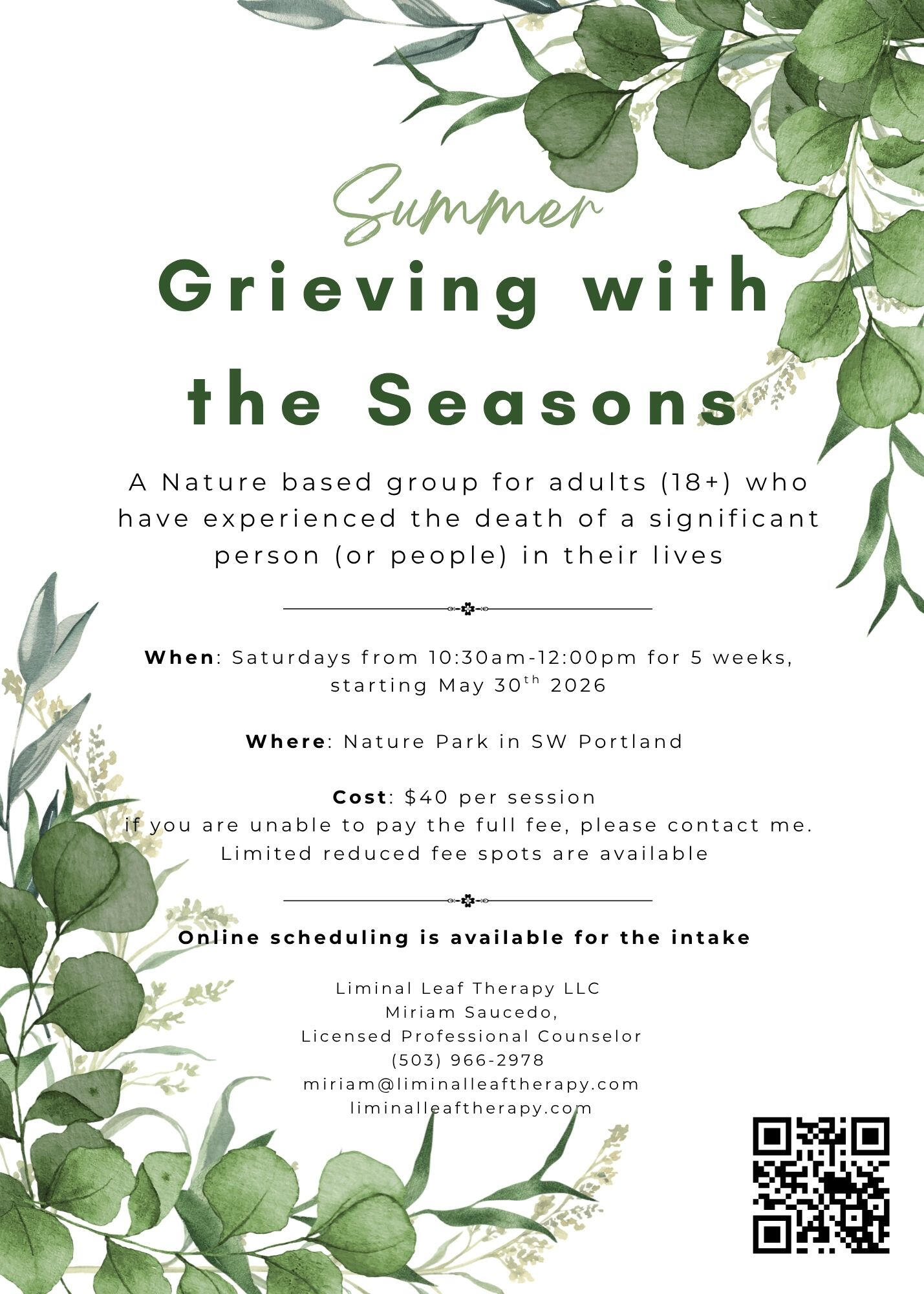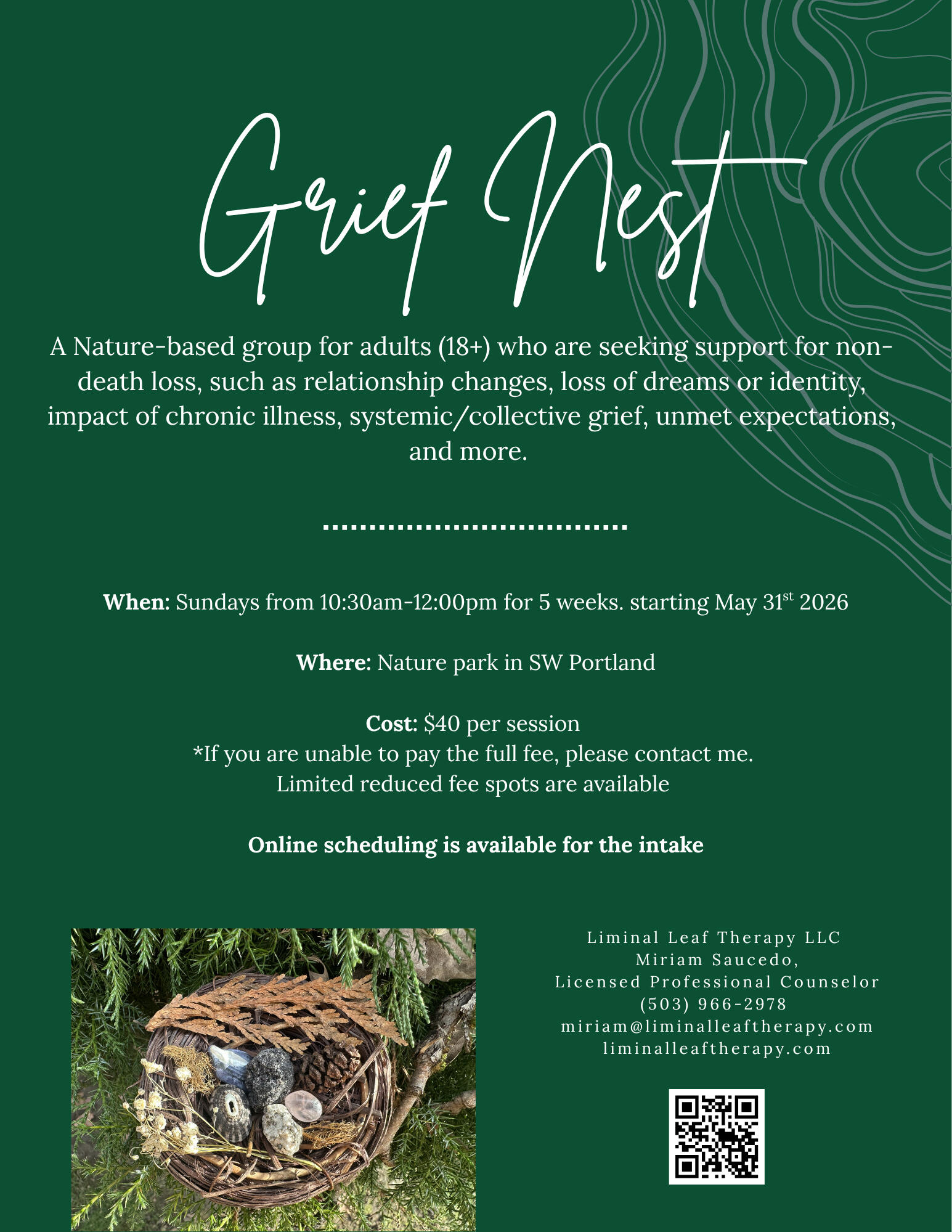 This group is for adults (18+) who have experienced the death of a significant person (or people) in their lives.When: The Summer group will meet on Saturdays from 10:30-12:00pm for 5 weeks, starting May 30th, 2026.Where: Nature park in SW PortlandCost: $40 per session